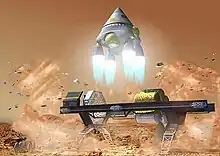 - un vaisseau et un lanceur, équipés d'un étage de descente pour atteindre le sol martien, qui permet de remonter l'équipage du sol martien jusqu'en orbite martienne ;