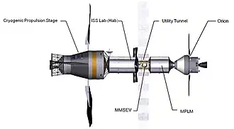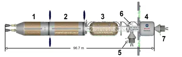 Dans le dernier scénario détaillé de la NASA en 2009 une mission martienne nécessite le développement de quatre vaisseaux qui sont assemblés en orbite et sont lancés vers Mars en 3 vols distincts :