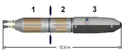 | Masse placée en orbite basse terrestre / posée sur le sol Lune/Mars | 118 tonnes / 7 t. | 400 à 1 000 tonnes / 60 à 80 tonnes | - Coût - Complexité (lancements multiples) |