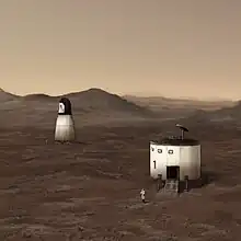 - un vaisseau équipé d'un étage de descente pour atteindre le sol martien, qui sert d'habitat à l'équipage sur Mars ;