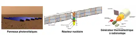 - utilisation des propulseurs ioniques alimentés par une centrale électrique (panneaux solaires ou petit réacteur nucléaire). L'avantage est de réduire la masse d'ergols à embarquer, mais au détriment de la durée du voyage ou de la complexité du scénario, avec par exemple un rendez-vous en orbite haute terrestre entre le vaisseau interplanétaire et une capsule amenant les astronautes, ceci pour éviter la longue montée en orbite du vaisseau à propulsion ionique ;