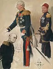 L'état-major ottoman. Premier plan, de g. à dr. : Djevat Pacha, Suleyman Numan Pacha (chef du service sanitaire), Mehmed Essad Pacha, Otto Liman von Sanders, Vehib Pacha et Rauf Orbay, ministre de la Marine