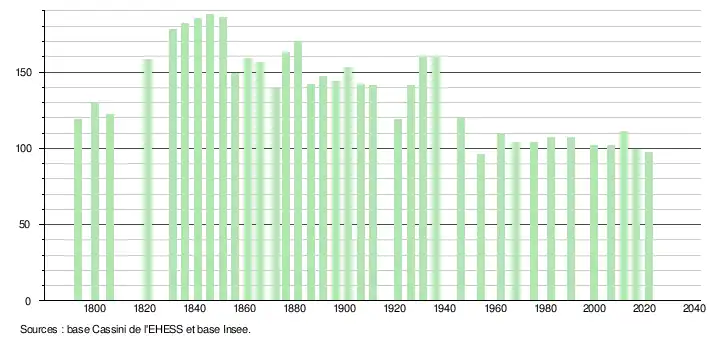 L'évolution du nombre d'habitants est connue à travers les recensements de la population effectués dans la commune depuis 1793. Pour les communes de moins de 10 000 habitants, une enquête de recensement portant sur toute la population est réalisée tous les cinq ans, les populations légales des années intermédiaires étant quant à elles estimées par interpolation ou extrapolation[19]. Pour la commune, le premier recensement exhaustif entrant dans le cadre du nouveau dispositif a été réalisé en 2006[20].