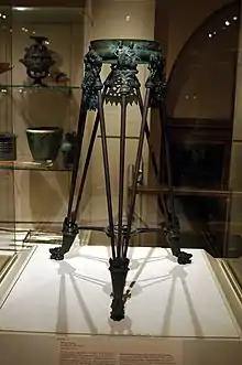 - Le trépied destiné à supporter un vase[3], un chaudron (bronze et fer à la villa Giulia), un bassin (Londres)[4].