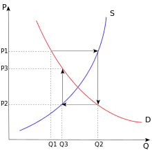 Dans le graphique avec équilibre stable, si la quantité produite est le prix payé est . Ce prix élevé conduit à une forte production à la période suivante (voir la courbe d’offre S) mais alors le prix payé sera bas (pour que la demande, D, puisse absorber cette quantité) et ainsi de suite. On obtient un graphique qui ressemble à une toile d’araignée.