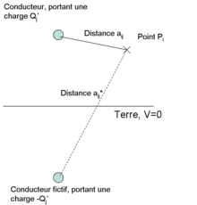 Afin de modéliser le potentiel nul de la terre, on utilise le principe des miroirs. C'est-à-dire qu'on modélise des conducteurs fictifs placés de manière symétrique à la terre par rapport aux conducteurs réels et chargés de manière opposée. La terre a alors un potentiel nul.