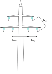 Pour le cas d'un système double (deux lignes triphasés de chaque côté du pylône)[5] :
