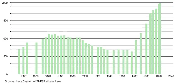 L'évolution du nombre d'habitants est connue à travers les recensements de la population effectués dans la commune depuis 1793. Pour les communes de moins de 10 000 habitants, une enquête de recensement portant sur toute la population est réalisée tous les cinq ans, les populations légales des années intermédiaires étant quant à elles estimées par interpolation ou extrapolation[16]. Pour la commune, le premier recensement exhaustif entrant dans le cadre du nouveau dispositif a été réalisé en 2005[17].