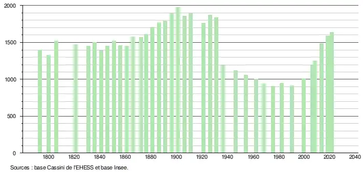 L'évolution du nombre d'habitants est connue à travers les recensements de la population effectués dans la commune depuis 1793. Pour les communes de moins de 10 000 habitants, une enquête de recensement portant sur toute la population est réalisée tous les cinq ans, les populations légales des années intermédiaires étant quant à elles estimées par interpolation ou extrapolation[23]. Pour la commune, le premier recensement exhaustif entrant dans le cadre du nouveau dispositif a été réalisé en 2008[24].
