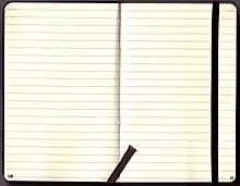 Vue intérieure d'un carnet Moleskine ligné ; la bande élastique est visible sur le côté droit, ainsi que le signet au centre.