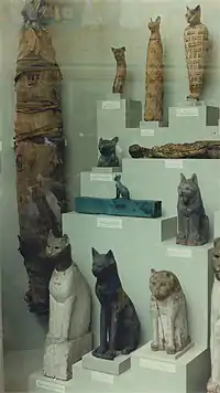 La médecine arabe use couramment de la mummia (en), poudre issue de ces momies égyptiennes qui était supposée avoir le don de guérir contre de nombreuses maladies (céphalées, nausée, paralysie, maux de gorge, fractures, tuberculose, etc.), être un bon engrais. Cette médecine est introduite en Europe lors du retour des croisades. Cette poudre devient si prisée (davantage la mummia bianca provenant de cadavres de fillettes mortes vierges, que la mummia nera issue de momies enduites de bitume[7]) que se développe au XVe siècle un commerce des momies égyptiennes mais aussi des escroqueries, notamment leur substitution par des corps volés sur les gibets[8]. Se développèrent aussi le baume de momie, la liqueur de momie aux supposées vertus curatrices[9]. Au XVIe siècle, le brun momie est utilisé en alchimie, comme teinture et comme pigment pour les peintures à l'huile. Au XVIIIe siècle, des séances publiques de démaillotement de momies se déroulent dans les cabinets de curiosités. Jusqu'au XIXe siècle, des milliers de momies humaines et animales sont importés d'Égypte pour servir de papier d'emballage, de bois de chauffage, de combustible pour les machines à vapeur ou d'engrais fertilisants[10]. En 1888, les momies de 300 000 chats sont découvertes dans une nécropole égyptienne. Réduites en poudre, 19 tonnes sont expédiées pour servir d'engrais à des agriculteurs d'Angleterre[11].