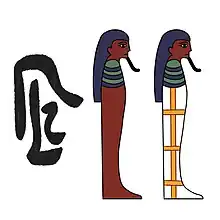 C'est un déterminatif des termes désignant une momie, des termes désignant une statue et des substantifs se rapportant à la notion de transformation et de l'aspect, forme, hypostase.