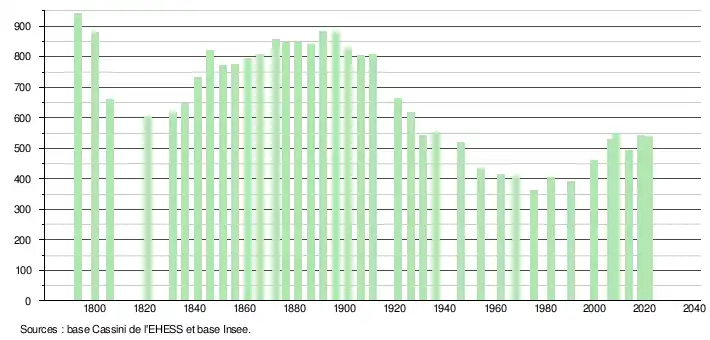 L'évolution du nombre d'habitants est connue à travers les recensements de la population effectués dans la commune depuis 1793. Pour les communes de moins de 10 000 habitants, une enquête de recensement portant sur toute la population est réalisée tous les cinq ans, les populations légales des années intermédiaires étant quant à elles estimées par interpolation ou extrapolation[19]. Pour la commune, le premier recensement exhaustif entrant dans le cadre du nouveau dispositif a été réalisé en 2008[20].
