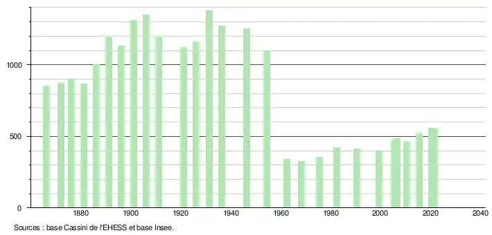 L'évolution du nombre d'habitants est connue à travers les recensements de la population effectués dans la commune depuis 1866. Pour les communes de moins de 10 000 habitants, une enquête de recensement portant sur toute la population est réalisée tous les cinq ans, les populations légales des années intermédiaires étant quant à elles estimées par interpolation ou extrapolation[15]. Pour la commune, le premier recensement exhaustif entrant dans le cadre du nouveau dispositif a été réalisé en 2005[16].