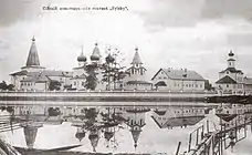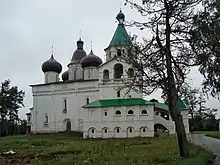 - L'église-catholicon de la Trinité est construite en 1589 avec la permission du tzar Fiodor Ier du 8 novembre 1587. Elle est terminée en 1606 et consacrée l'année suivante[8]. La construction est effectuée par des maçons et tailleurs de pierre de Vologda[8]. Elle est construite dans le style architectural de Novgorod avec des apports moscovites (liens d'arcature dans les murs du mur ouest, large entablement sous le zakomar)[9].