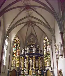 L'église gothique que l'on visite aujourd'hui est du XIVe siècle. C'est une église à nef unique en neuf croisées et un chœur-5/8[63]. La nef a été construite en trois phases. Le chœur et la nef sont voûtées par croisées d'ogive.