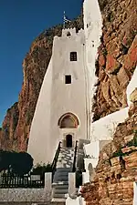 Le monastère est construit sur à flanc de falaise, à une altitude d'environ 300 mètres[6], grâce à quoi il est à l'abri des pirates et autres attaques ennemies. Le style du bâtiment du monastère est typique de l'architecture cycladique traditionnelle. Aujourd'hui, il est peint dans une couleur blanche typique, mais dans le passé, il était délibérément plus discret. Le bâtiment a une largeur d'environ 40 mètres et compte huit étages[6]. À l'intérieur, le monastère est un « labyrinthe » composé de petites pièces et d'escaliers étroits. Des arcs en ogive indiquent une influence latine, au cours de la période vénitienne[9].