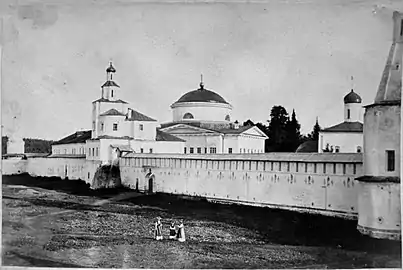 Jusqu'à l'incendie de 1689, le monastère est construit en bois. L'ensemble architectural de pierre commence à être construit au tournant du XVIIe siècle et du XVIIIe siècle. Les murs crénelés et les tours sont construits en 1690-1717. Il s'étendent dans un périmètre de plus de 500 mètres de côté donnant un aspect pittoresque de forteresse ou de kremlin au monastère[1],[8].
