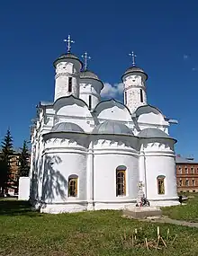 La cathédrale de la Déposition-de-la-Robe (1520-1560) est un exemple d'édifice sans piliers avec, du côté de l'autel, trois absides accolées. La construction est en carré, à quatre façades et l'ensemble est recouvert de trois coupoles. L'intérieur est dépourvu de structures porteuses apparentes, sinon les murs latéraux. L'édifice est couronné de trois hautes et légères coupoles, ce qui est inhabituel à cette époque, dans ce type de bâtiment. Les murs lisses sont découpés d'embrasures de fenêtres de style simple ; quant aux façades de côté elles sont surmontées de zakomars. Ils sont quatre, mais séparés sur la façade par trois pilastres. Ils surmontent un portail au centre de la façade. Le parvis, construit en 1688 à l'ouest de l'église, se distingue par une décoration très riche comprenant un portail sculpté, avec des colonnes garnies de tresses et de faïences, entouré de chambranles décorés. Les coupoles de la cathédrale ont connu quelques transformations au cours des siècles. Leur forme initiale de casque a été modifiée en forme de bulbes au cours du XIXe siècle. En 1929, la cathédrale fut transformée en centrale électrique et ce n'est qu'en 1960 que lors de la restauration qui a lieu à cette époque, que ces coupoles retrouvent leur forme originelle[6]