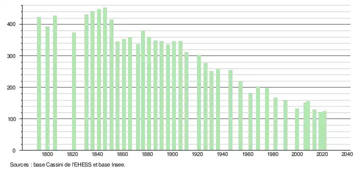 L'évolution du nombre d'habitants est connue à travers les recensements de la population effectués dans la commune depuis 1793. Pour les communes de moins de 10 000 habitants, une enquête de recensement portant sur toute la population est réalisée tous les cinq ans, les populations légales des années intermédiaires étant quant à elles estimées par interpolation ou extrapolation[17]. Pour la commune, le premier recensement exhaustif entrant dans le cadre du nouveau dispositif a été réalisé en 2008[18].