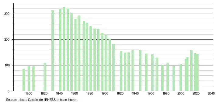 | L'évolution du nombre d'habitants est connue à travers les recensements de la population effectués dans la commune depuis 1793. Pour les communes de moins de 10 000 habitants, une enquête de recensement portant sur toute la population est réalisée tous les cinq ans, les populations légales des années intermédiaires étant quant à elles estimées par interpolation ou extrapolation[25]. Pour la commune, le premier recensement exhaustif entrant dans le cadre du nouveau dispositif a été réalisé en 2008[26]. En 2021, la commune comptait 144 habitants[Note 5], en diminution de 12,73 % par rapport à 2015 (Gers : +0,79 %, France hors Mayotte : +1,84 %). |