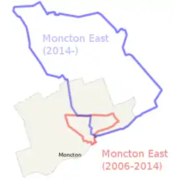 Les circonscriptions de Monton-Est (2006-2014) et de Moncton-Est (2014-) par rapport à la ville de Moncton.