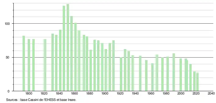 L'évolution du nombre d'habitants est connue à travers les recensements de la population effectués dans la commune depuis 1793. Pour les communes de moins de 10 000 habitants, une enquête de recensement portant sur toute la population est réalisée tous les cinq ans, les populations légales des années intermédiaires étant quant à elles estimées par interpolation ou extrapolation[20]. Pour la commune, le premier recensement exhaustif entrant dans le cadre du nouveau dispositif a été réalisé en 2007[21].