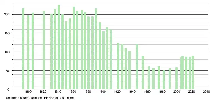 L'évolution du nombre d'habitants est connue à travers les recensements de la population effectués dans la commune depuis 1793. Pour les communes de moins de 10 000 habitants, une enquête de recensement portant sur toute la population est réalisée tous les cinq ans, les populations légales des années intermédiaires étant quant à elles estimées par interpolation ou extrapolation[26]. Pour la commune, le premier recensement exhaustif entrant dans le cadre du nouveau dispositif a été réalisé en 2007[27].