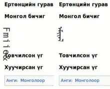 | Mongol bitchig Hudum bitchig Alphabet mongol traditionnel | |