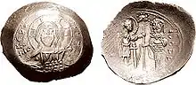 La monnaie byzantine, utilisée dans l’Empire romain d’Orient après la chute de Rome en 476, reposait sur deux types de pièces : le solidus (pl. solidi) d’or qui sera appelé nomisma (pl. nomismata)[N 1] lorsque le grec remplaça le latin comme langue d’administration, et diverses pièces de bronze. Les pièces d’argent, absentes au début de l’empire en raison de la difficulté de fixer leur parité avec l’or, ne firent leur apparition que vers la fin de l’empire.