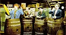Autre carte promotionnelle du film. On reconnaît, de gauche à droite : Harpo, Zeppo, Chico et Groucho, en passagers clandestins de bateau, cachés dans des tonneaux de harengs salés.