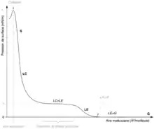 Une monocouche peut être comprimée en modifiant la surface disponible par l'action d'une barrière mobile dans une balance de Langmuir. Si l'on mesure la tension superficielle durant la compression, on obtient un isotherme de compression (ci-contre) qui montre la variation de la pression de surface π, en mN/m, en fonction de l'aire moléculaire (en Å2/molécule). Ceci est équivalent à ce que l'on observe dans un modèle en trois dimensions : la pression varie en fonction du volume.