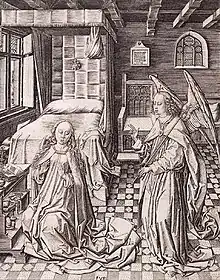 L'Annonciation (vers 1480), gravure au burin sur cuivre, 204 × 161 mm, ici un exemplaire du Rijksmuseum Amsterdam.
