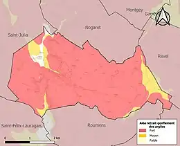 Le retrait-gonflement des sols argileux est susceptible d'engendrer des dommages importants aux bâtiments en cas d’alternance de périodes de sécheresse et de pluie. 98 % de la superficie communale est en aléa moyen ou fort (88,8 % au niveau départemental et 48,5 % au niveau national). Sur les 195 bâtiments dénombrés sur la commune en 2019, 183 sont en aléa moyen ou fort, soit 94 %, à comparer aux 98 % au niveau départemental et 54 % au niveau national. Une cartographie de l'exposition du territoire national au retrait gonflement des sols argileux est disponible sur le site du BRGM[25],[Carte 3].