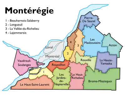 La Montérégie est une région administrative du Québec délimitée à l'ouest par la région de Montréal et à l'est par les régions de l'Estrie et du Centre-du-Québec. Elle s'étend du fleuve Saint-Laurent jusqu'à la frontière avec les États-Unis. Son nom vient des collines montérégiennes, presque toutes situées sur son territoire.