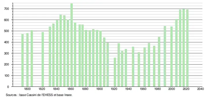 L'évolution du nombre d'habitants est connue à travers les recensements de la population effectués dans la commune depuis 1793. Pour les communes de moins de 10 000 habitants, une enquête de recensement portant sur toute la population est réalisée tous les cinq ans, les populations légales des années intermédiaires étant quant à elles estimées par interpolation ou extrapolation[22]. Pour la commune, le premier recensement exhaustif entrant dans le cadre du nouveau dispositif a été réalisé en 2006[23].