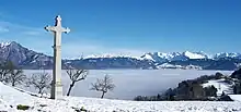 Du belvédère du Faucigny, situé derrière l'église, on voit le Jura, le Salève, Le Môle, le Pic de Marcelly, Les Hauts Forts, les Dents du Midi, les Dents Blanches, Le Grand Ruan, Tour Sallière, le Tenneverge, Le Buet, l'Aiguille Verte.
