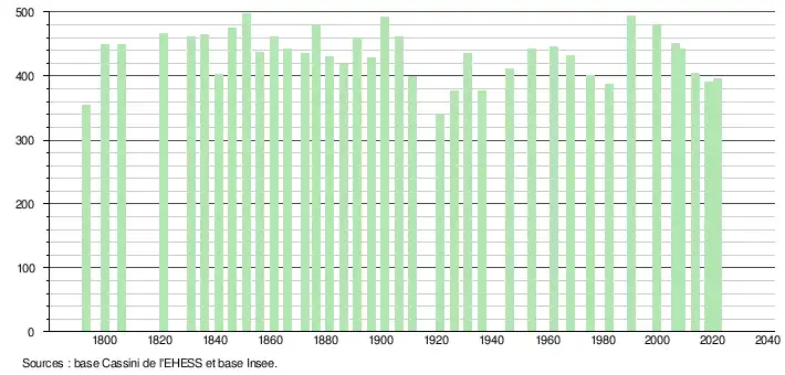 L'évolution du nombre d'habitants est connue à travers les recensements de la population effectués dans la commune depuis 1793. Pour les communes de moins de 10 000 habitants, une enquête de recensement portant sur toute la population est réalisée tous les cinq ans, les populations légales des années intermédiaires étant quant à elles estimées par interpolation ou extrapolation[29]. Pour la commune, le premier recensement exhaustif entrant dans le cadre du nouveau dispositif a été réalisé en 2008[30].