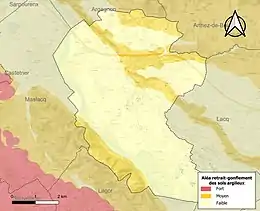 Le retrait-gonflement des sols argileux est susceptible d'engendrer des dommages importants aux bâtiments en cas d’alternance de périodes de sécheresse et de pluie[35]. 24 % de la superficie communale est en aléa moyen ou fort (59 % au niveau départemental et 48,5 % au niveau national)[Carte 5]. Depuis le , en application de la loi ELAN, différentes contraintes s'imposent aux vendeurs, maîtres d'ouvrages ou constructeurs de biens situés dans une zone classée en aléa moyen ou fort[Note 7],[36].