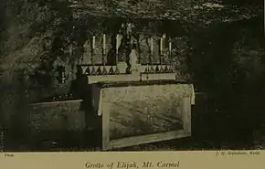 L'ordre du Carmel fut fondé sur le site qui, selon ses fondateurs, serait l'emplacement de la grotte d’Élie. Il est bâti à 520 m d'altitude, à l'extrémité nord-ouest de la chaîne de montagne[1], son point le plus élevé. Bien qu'il n'y ait aucune preuve, la tradition carmélite pense qu'une communauté d'ermites juifs y a vécu[18], depuis l'époque d’Élie jusqu'à la fondation du couvent. La règle des Carmélites de 1281 indique : « Depuis le temps où Élie et Élisée ont habité pieusement sur le mont Carmel, des prêtres et les prophètes juifs et chrétiens ont vécu des vies dignes d'éloges dans la sainte pénitence, près du site de la fontaine d’Élisée, dans une succession ininterrompue »[32].
