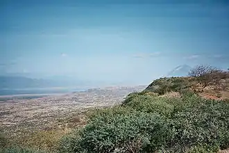 Vue de la vallée du Grand Rift à l'extrême-nord de la Tanzanie. Plusieurs escarpements sont visibles en premier plan. Le volcan actif Ol Doinyo Lengaï, distant de 45 km par rapport au point de vue, domine l'image à droite. Le lac Natron occupe le fond de la vallée sur la gauche de l'image où le flanc méridional du mont Gelai est également visible. Enfin, le Kitumbeine est visible en arrière-plan, au centre gauche de l'image, à environ 75 km de distance