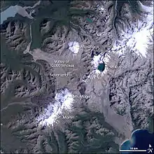 Image satellite du mont Mageik entouré par le Novarupta, le mont Katmai, la vallée des Dix Mille Fumées, le mont Griggs et le mont Martin.