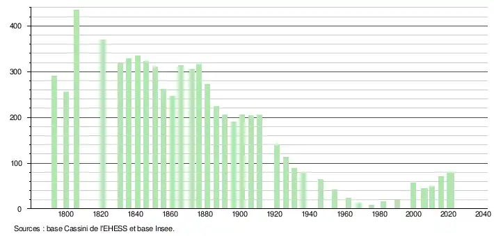 L'évolution du nombre d'habitants est connue à travers les recensements de la population effectués dans la commune depuis 1793. Pour les communes de moins de 10 000 habitants, une enquête de recensement portant sur toute la population est réalisée tous les cinq ans, les populations légales des années intermédiaires étant quant à elles estimées par interpolation ou extrapolation[42]. Pour la commune, le premier recensement exhaustif entrant dans le cadre du nouveau dispositif a été réalisé en 2005[43].