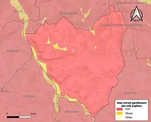 Le retrait-gonflement des sols argileux est susceptible d'engendrer des dommages importants aux bâtiments en cas d’alternance de périodes de sécheresse et de pluie[21]. La totalité de la commune est en aléa moyen ou fort (91,8 % au niveau départemental et 48,5 % au niveau national)[Carte 2]. Depuis le , en application de la loi ELAN, différentes contraintes s'imposent aux vendeurs, maîtres d'ouvrages ou constructeurs de biens situés dans une zone classée en aléa moyen ou fort[Note 3],[22].