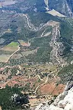 Au pied des falaises, on trouve en plus des massifs de broussailles, chêne vert, chêne kermès, pin d'Alep (population fortement réduite après l'incendie de 1989) mais aussi des cultures (amandiers et oliviers).