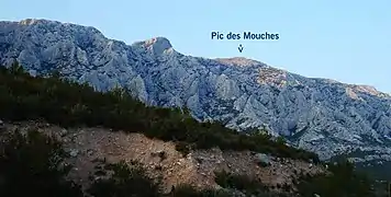 - Le pic des Mouches culmine à 1 011 mètres ou à 1 021 mètres d'altitude selon les sources.