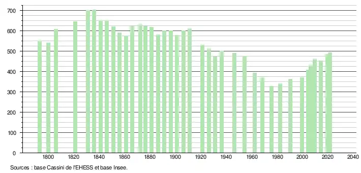 L'évolution du nombre d'habitants est connue à travers les recensements de la population effectués dans la commune depuis 1793. Pour les communes de moins de 10 000 habitants, une enquête de recensement portant sur toute la population est réalisée tous les cinq ans, les populations légales des années intermédiaires étant quant à elles estimées par interpolation ou extrapolation[19]. Pour la commune, le premier recensement exhaustif entrant dans le cadre du nouveau dispositif a été réalisé en 2004[20].