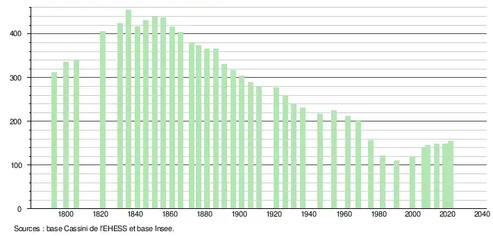- Population municipale légale en vigueur au 1er janvier 2024, millésimée 2021, définie dans les limites territoriales en vigueur au 1er janvier 2023, date de référence statistique : 1er janvier 2021.