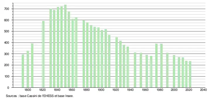 | L'évolution du nombre d'habitants est connue à travers les recensements de la population effectués dans la commune depuis 1793. Pour les communes de moins de 10 000 habitants, une enquête de recensement portant sur toute la population est réalisée tous les cinq ans, les populations légales des années intermédiaires étant quant à elles estimées par interpolation ou extrapolation[26]. Pour la commune, le premier recensement exhaustif entrant dans le cadre du nouveau dispositif a été réalisé en 2006[27]. En 2021, la commune comptait 234 habitants[Note 5], en diminution de 4,1 % par rapport à 2015 (Hautes-Pyrénées : +1,04 %, France hors Mayotte : +1,84 %). |