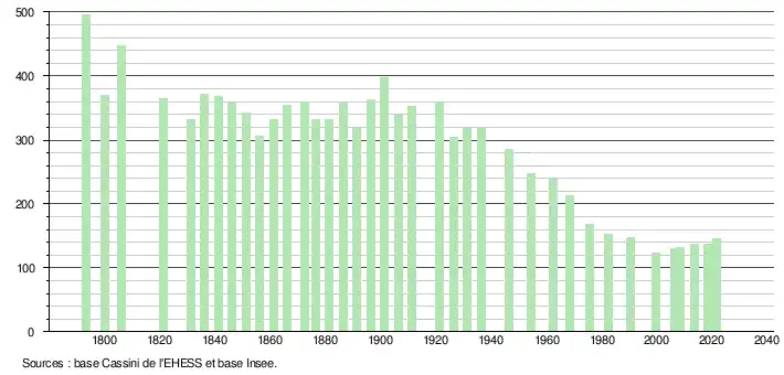 L'évolution du nombre d'habitants est connue à travers les recensements de la population effectués dans la commune depuis 1793. Pour les communes de moins de 10 000 habitants, une enquête de recensement portant sur toute la population est réalisée tous les cinq ans, les populations légales des années intermédiaires étant quant à elles estimées par interpolation ou extrapolation[26]. Pour la commune, le premier recensement exhaustif entrant dans le cadre du nouveau dispositif a été réalisé en 2008[27].